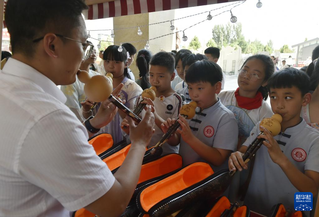 6月8日,学生们在活动现场体验吹奏葫芦丝。