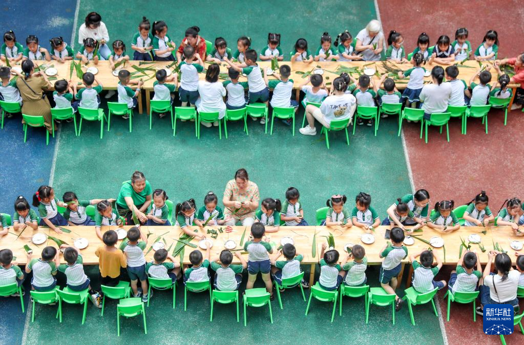 6月19日,贵州省遵义市余庆县羽翅幼儿园的孩子们在学习包粽子。