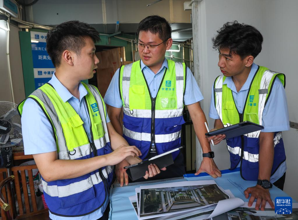 伍涛(中)和同事在项目部研究装饰施工效果和设计方案还原程度(6月26日摄)。