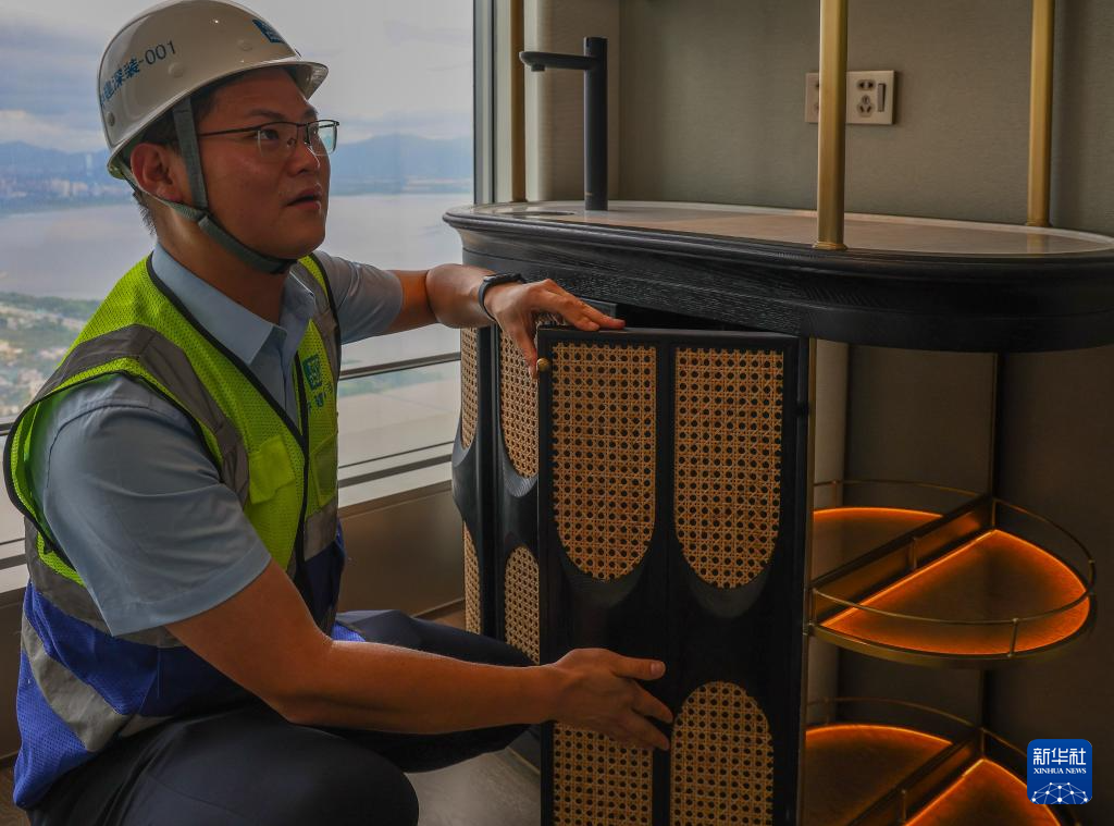 伍涛(左)和同事检查客房床头屏风的榫卯工艺金属构件(6月26日摄)。
