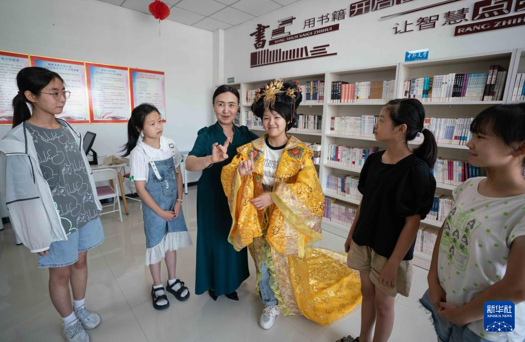 7月6日,在黄骅市海滨学院社区“多彩暑期·向阳花开”公益课堂,志愿者教孩子们戏曲表演动作。