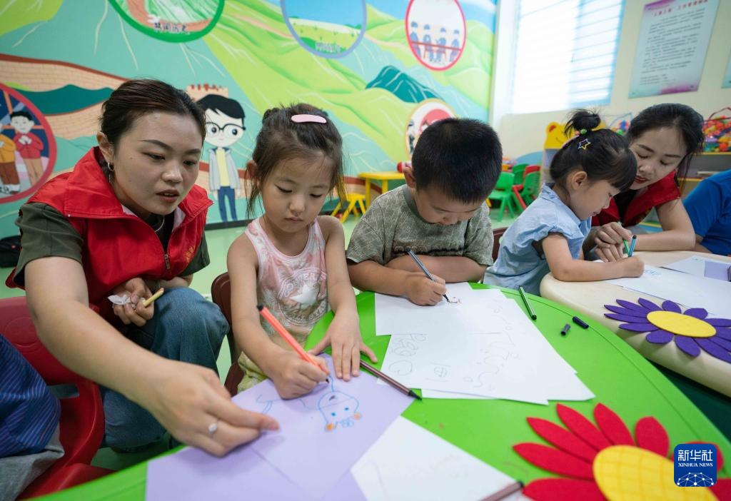 7月6日,在黄骅市海滨学院社区“多彩暑期·向阳花开”公益课堂,志愿者教孩子们画画。