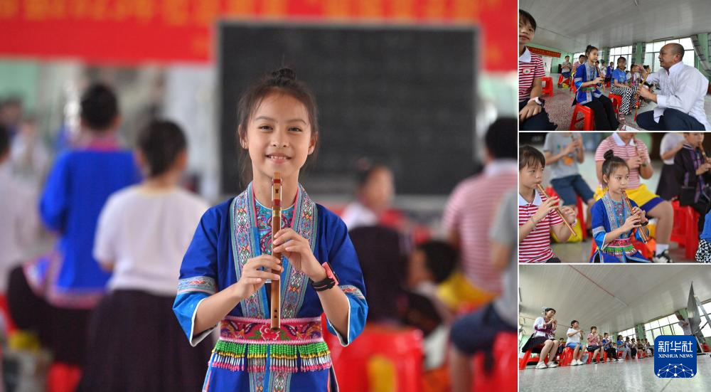 拼版照片:左图为广西融水苗族自治县杆洞乡党鸠村9岁的小学生梁文雄(7月5日摄);右图为梁文雄跟着爷爷学习吹奏芦笙(照片均摄于7月6日)。梁文雄很喜欢吹芦笙,每到假期,他都会跟爷爷、爸爸学习吹芦笙。