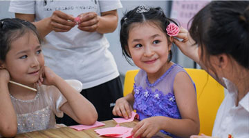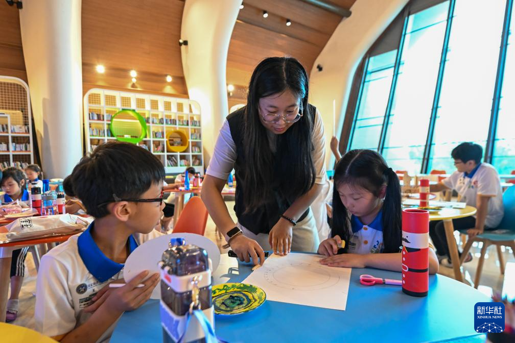 7月29日,在国家海洋博物馆,学生们在工作人员指导下制作“时间之钟”,从时间与空间尺度认识世界。