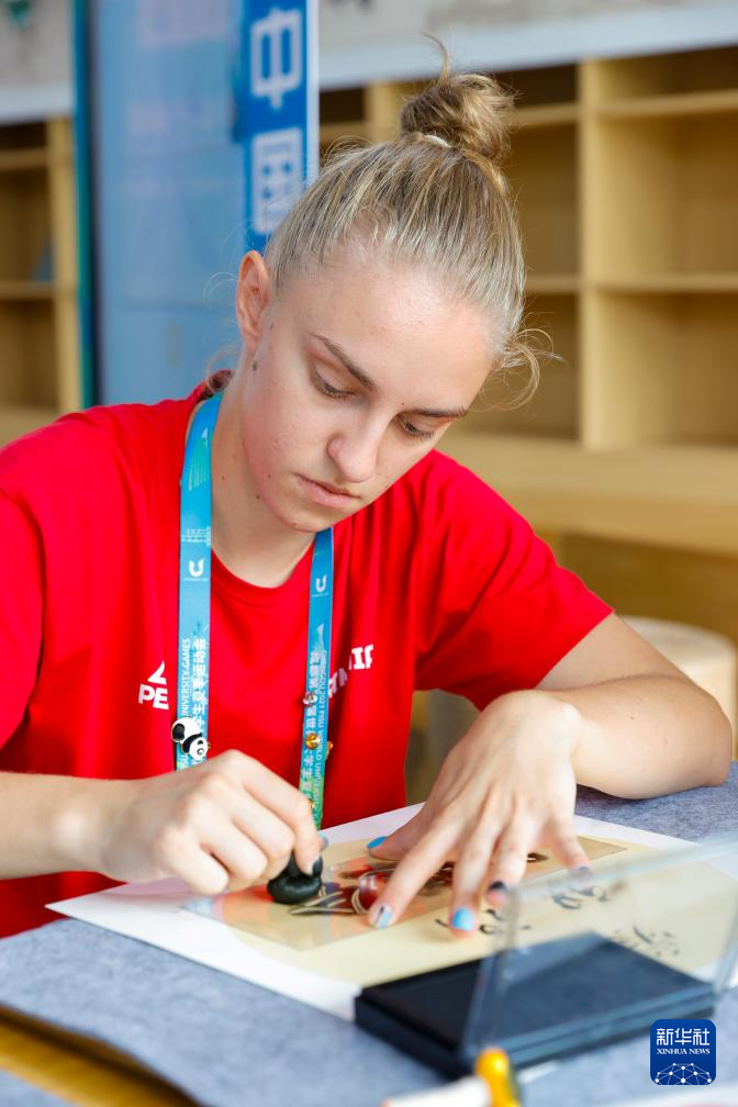 7月31日,在成都大运村的“汉语桥”中文学习互动体验区,罗马尼亚运动员斯特凡妮娅-帕特里夏·克蒂内安通过拓印的方式感受中国汉字的魅力。