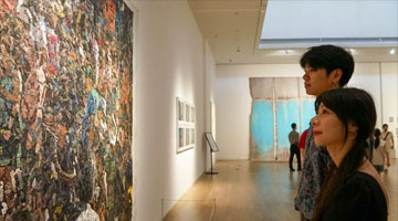 8月3日,河南省禹州市神垕镇一家钧瓷企业的工作人员在展厅里向来访者介绍钧瓷作品。