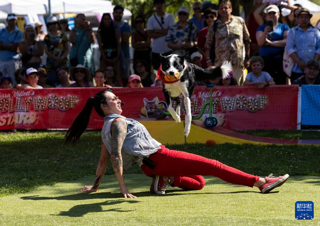 9月4日,一名表演者与她的宠物犬在加拿大多伦多国际街头艺人节上表演。