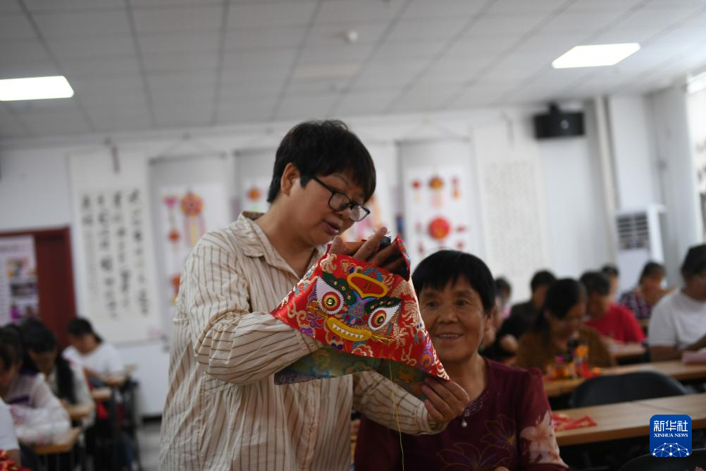 9月8日,在宝鸡西秦刺绣文化产业园,千阳继红职业技能培训学校的校长张继红(左)在指导绣娘绣制手工艺品。陕西千阳县是国家级非物质文化遗产“西秦刺绣”的重要发祥地和传承地。近年来,千阳县将西秦刺绣作为助农增收的重要产业,推动非遗项目产业化发展,助力乡村振兴。