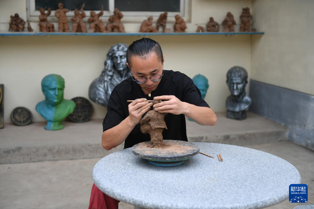9月8日,在陕西宝鸡市西府里文化艺术村,金台区非物质文化遗产“周氏泥塑”技艺传承人周少平在创作泥塑作品。