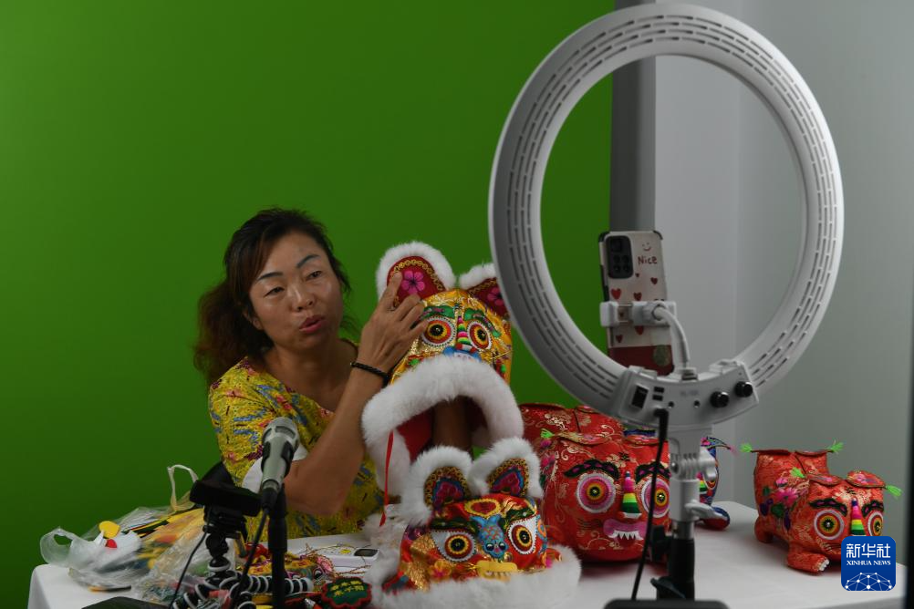 9月8日,在宝鸡西秦刺绣文化产业园,千阳绣娘在直播间推广刺绣手工艺品。陕西千阳县是国家级非物质文化遗产“西秦刺绣”的重要发祥地和传承地。近年来,千阳县将西秦刺绣作为助农增收的重要产业,推动非遗项目产业化发展,助力乡村振兴。
