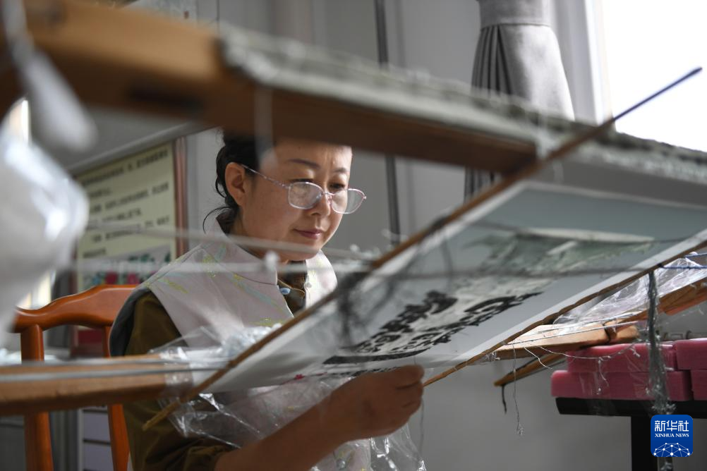 9月8日,在宝鸡西秦刺绣文化产业园,千阳绣娘在绣制工艺品。陕西千阳县是“西秦刺绣”的重要发祥地和传承地。近年来,千阳县将西秦刺绣作为助农增收的重要产业,推动非遗项目产业化发展,助力乡村振兴。