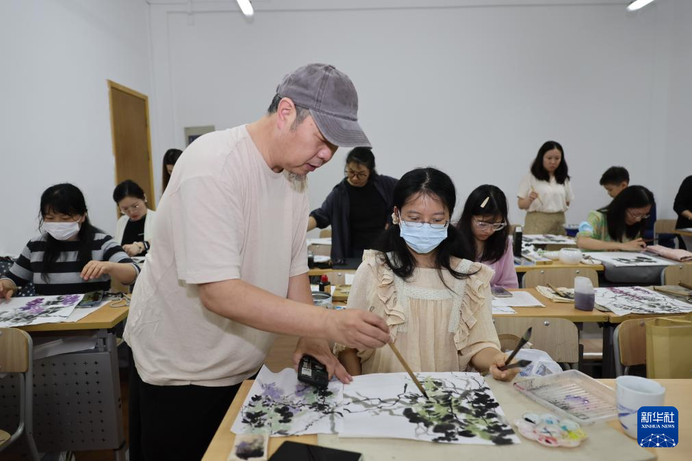 9月11日,在上海市群众艺术馆,老师指导学员画国画。