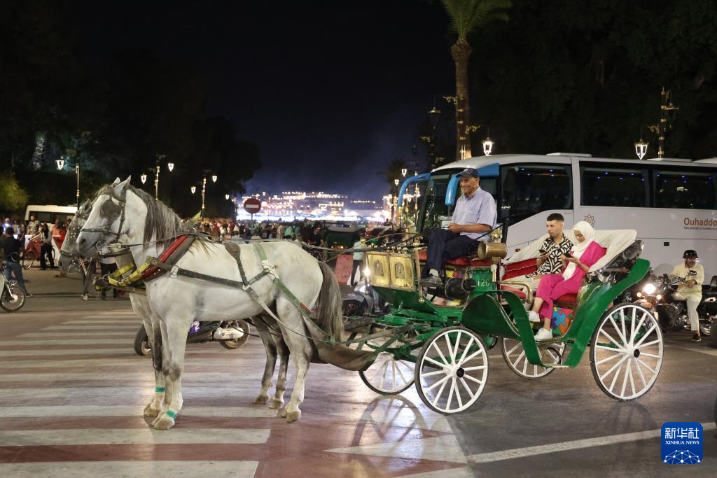 10月11日,游客在摩洛哥马拉喀什街头乘坐观光马车。
