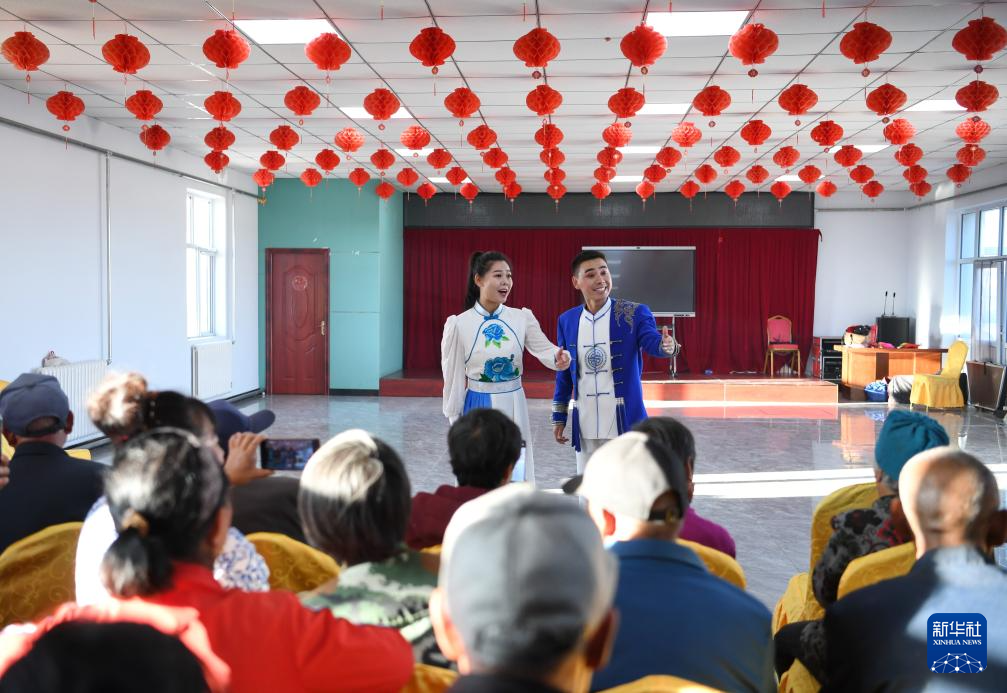 10月13日,河北省康保县二人台艺术团演员在康保县大萝卜村为群众表演。