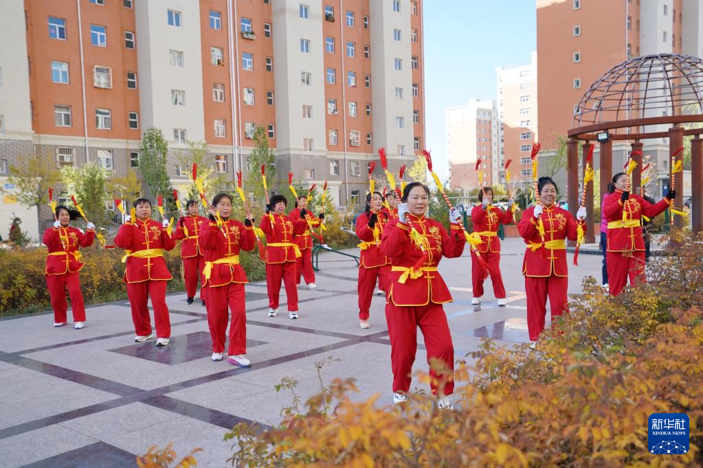 10月13日,河北省康保县怡安康城社区居民在练习康保二人台霸王鞭。