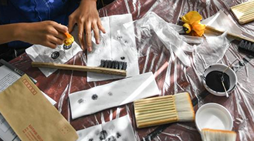 10月21日,一名小朋友向家长展示她制作的铜钱拓片。