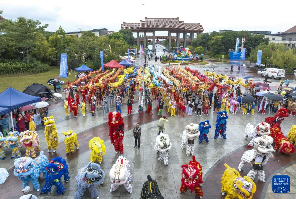 11月11日,在浙江省温州市三垟湿地公园北广场,舞狮队选手在比赛中。