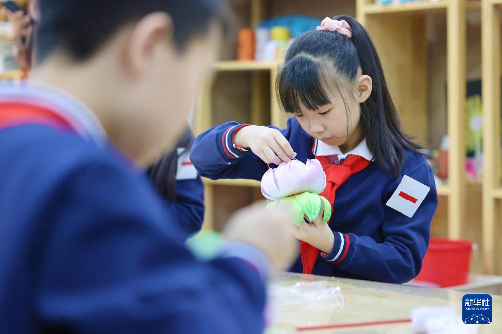 11月22日,河北省霸州市胜芳镇红光小学的学生在学习制作胜芳花灯。