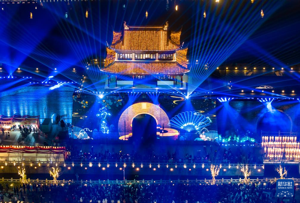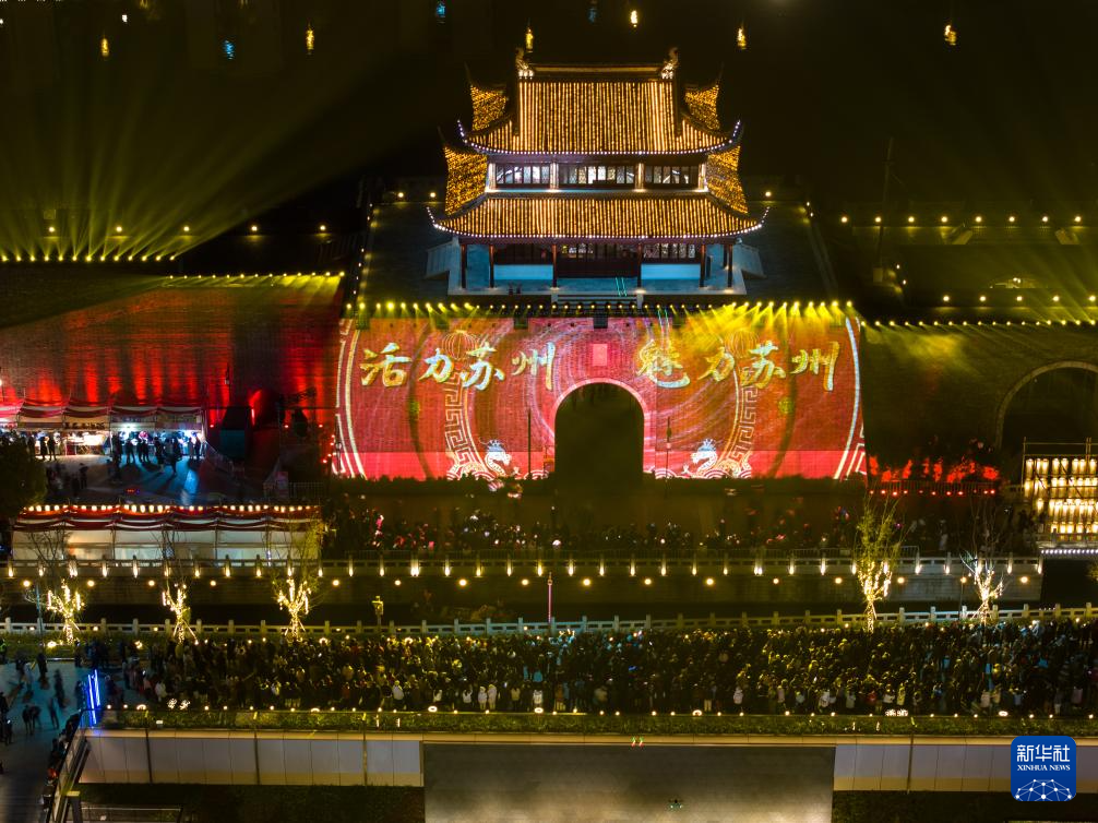 12月24日拍摄的江苏省苏州市相门古城墙灯光秀(无人机照片)。