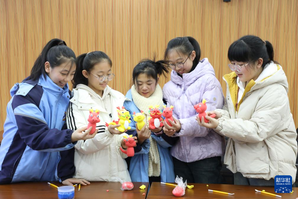 12月24日,在山东省滨州市沾化区富中社区,孩子们展示自己制作的面塑龙。