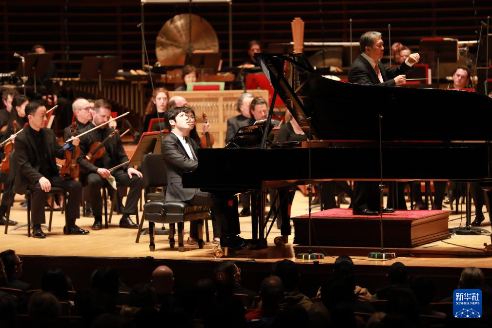 1月12日,在美国费城,中国钢琴家张昊辰(中)在2024年费城交响乐团新春音乐会上演出。