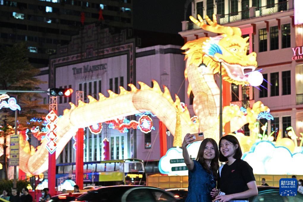 1月19日,游客在新加坡牛车水农历新年灯饰前拍照留影。新华社发(邓智炜 摄)