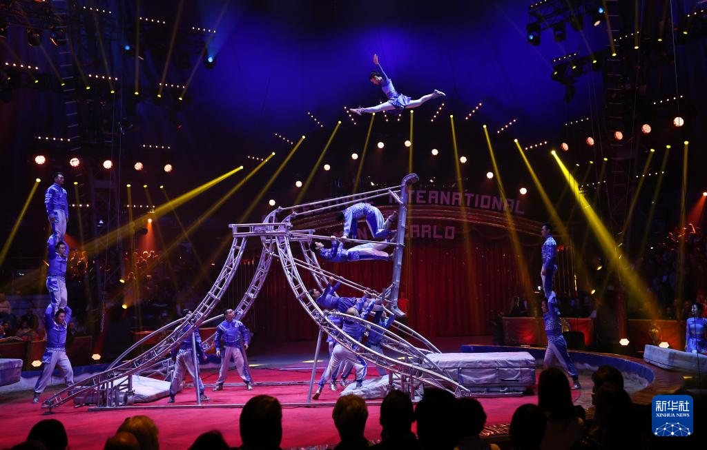 1月19日,中国武汉杂技团演员在摩纳哥蒙特卡洛表演节目《扬帆追梦·浪船》。