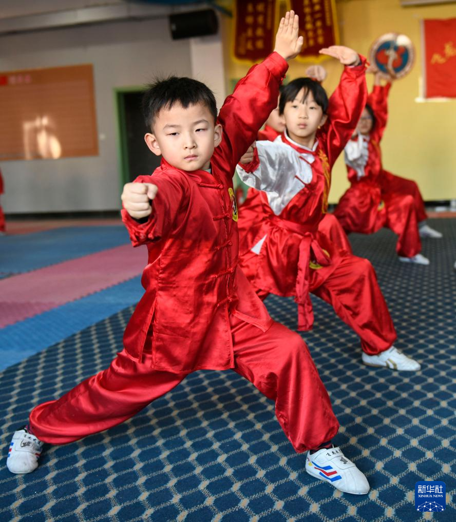1月23日,学生在河北省遵化市一家培训机构练习武术动作。