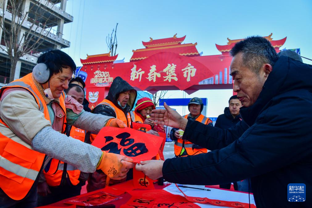 1月24日,在济南市医疗康养综合服务基地建设现场,济南市历城区美术馆志愿者为中建三局施工人员书写福字。