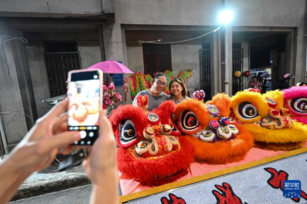 2月18日,在马来西亚槟城庙会,人们在舞狮活动前与狮头合影。