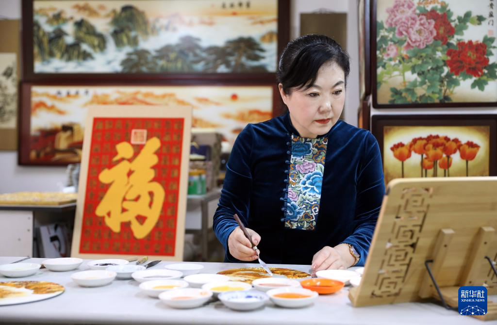 春节刚过,位于辽宁省凤城市凤凰山脚下的凤城景泰蓝珀晶画工作室内,55岁的锡伯族非遗传承人刘晶涛和她的徒弟们正忙着制作各式景泰蓝珀晶画。
