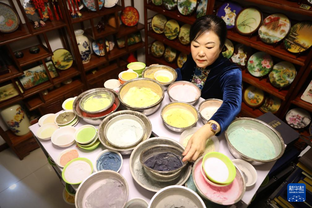 2月22日,刘晶涛在凤城市内的工作室挑选制作景泰蓝珀晶画需用的釉料。