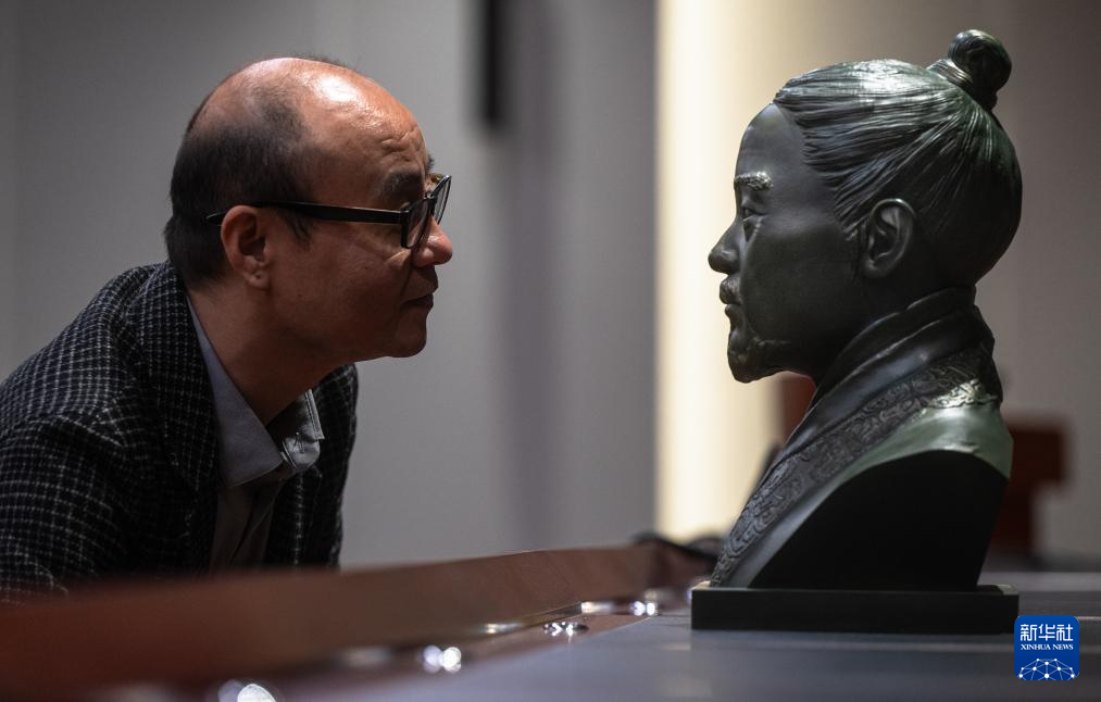 3月25日,湖北省博物馆学术研究中心主任杨理胜在观看云梦睡虎地秦简主人“喜”的复原像。