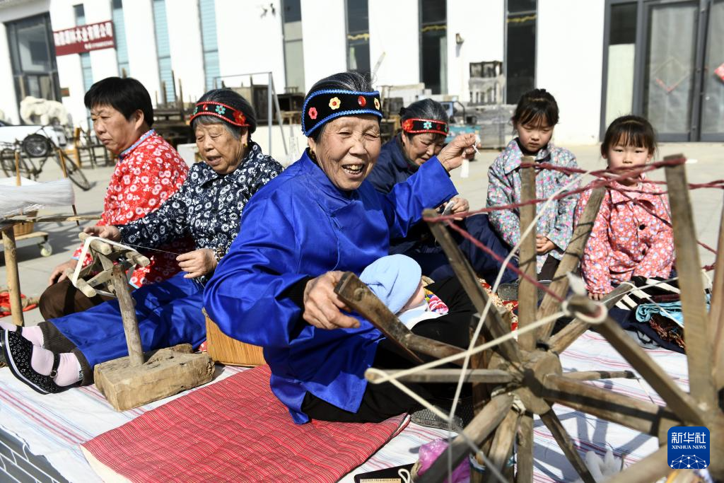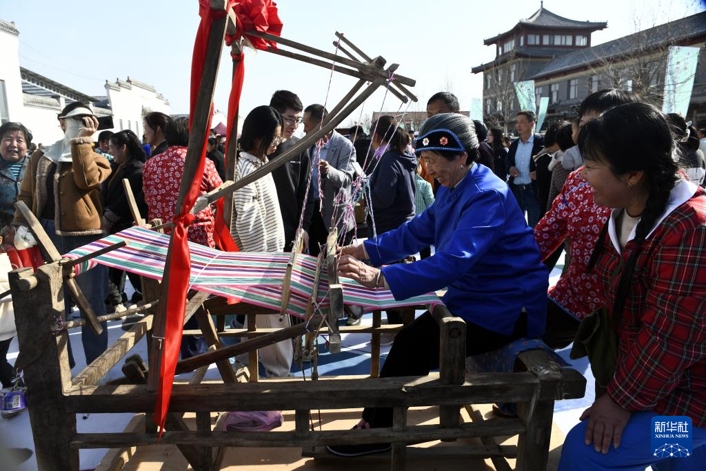 4月4日,水落坡镇乡村社火队队员在演绎鲁北乡村的老粗布织布场景。