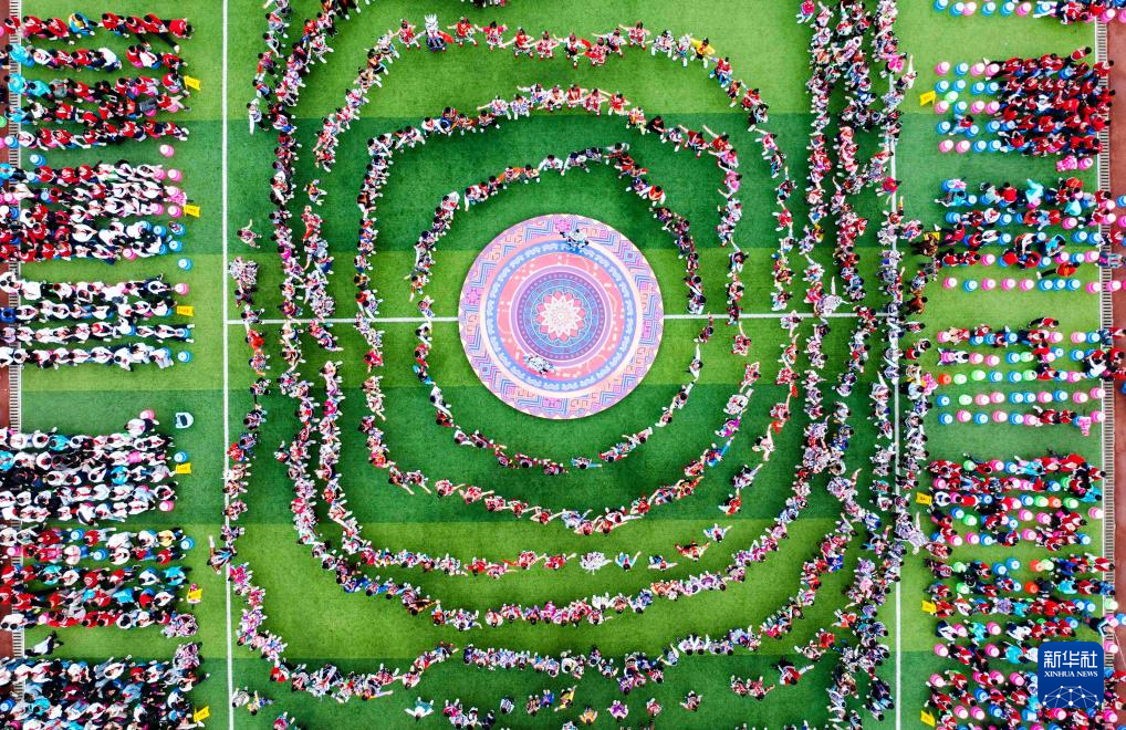 4月8日,在广西柳州市融水苗族自治县融水镇苗家小镇小学,师生载歌载舞(无人机照片)。