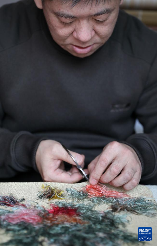 4月9日,申涛在位于营口市的家中进行缂丝作品的最后一道工序——修毛头。