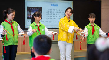 4月15日,小学生在国家安全年画娃娃艺术展上体验年画制作。