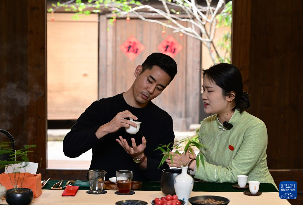 3月7日,在福建师范大学学中文的日本留学生平山义晃(左)在福州市上下杭街区体验福建功夫茶。