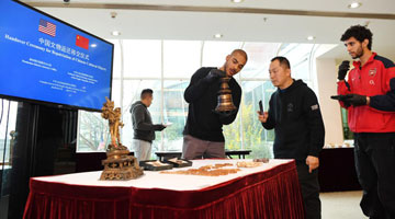 闫森林(右)在工作室向顾客介绍贺兰砚(3月8日摄)。