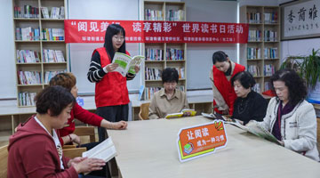 闫森林(中)在给宁夏艺术职业学院学生介绍贺兰砚作品(4月15日摄)。