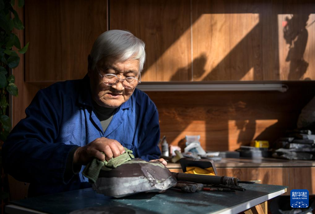闫森林在工作室擦拭用来制砚的贺兰石(3月8日摄)。