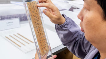 游客在四川西部文献修复中心参观展示的修复作品(4月19日摄)。