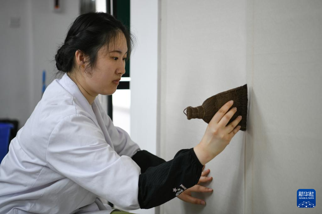 在四川西部文献修复中心,唐陈韵将修复用的托纸上墙晾干(4月19日摄)。