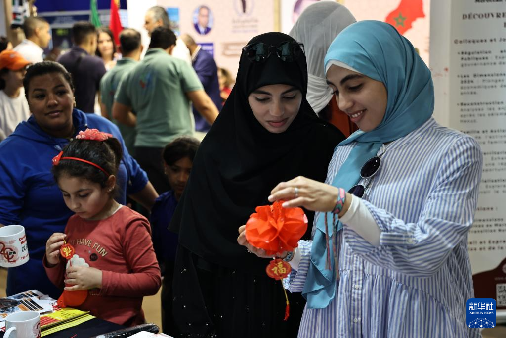 5月11日,人们在摩洛哥拉巴特国际书展的中国展台上选购汉语教材。