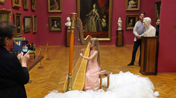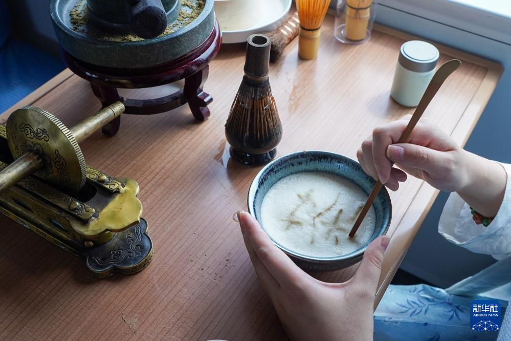 5月20日,旅客在工作人员的帮助下体验茶艺。