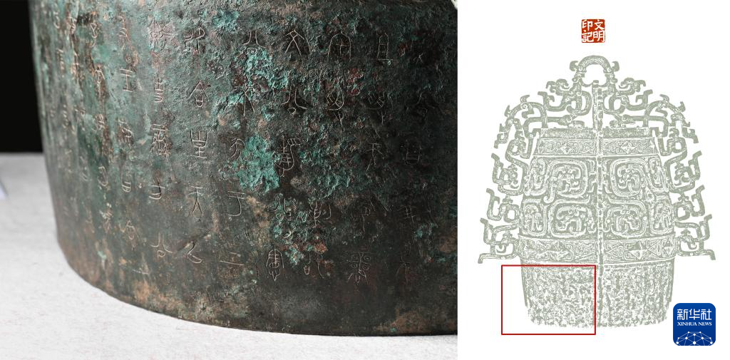 拼版照片,左图:秦公镈(一号镈)“鼓”部刻铭局部(2024年1月23日摄);右图:左图画面在镈身位置示意图(红框内)。