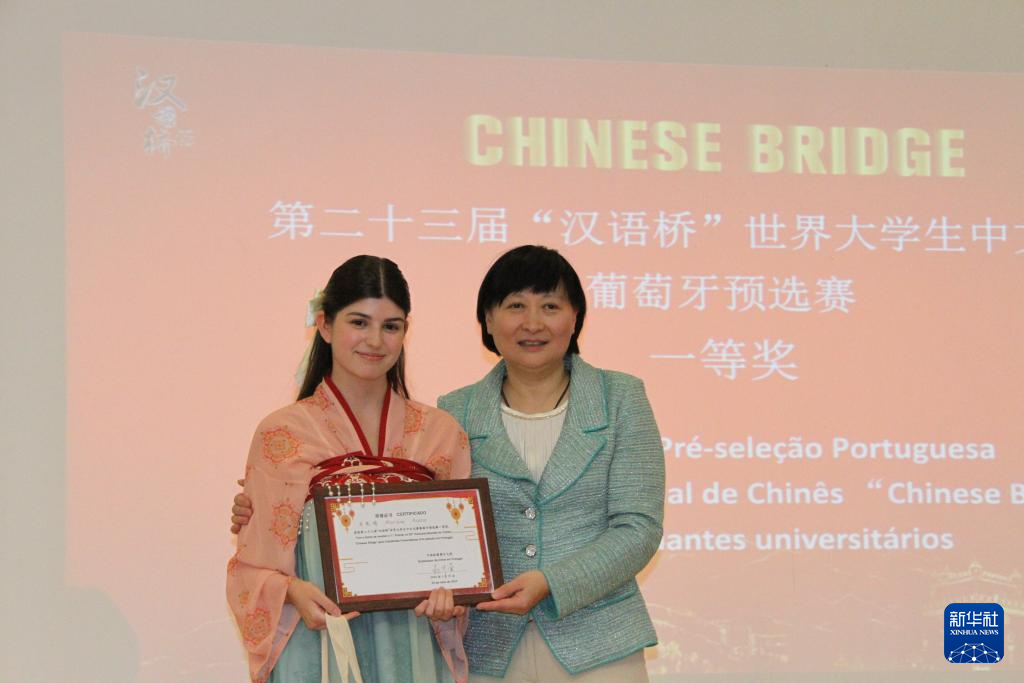 5月25日,在葡萄牙首都里斯本举行的第23届“汉语桥”世界大学生中文比赛葡萄牙赛区比赛上,参赛选手(左)获颁荣誉证书。