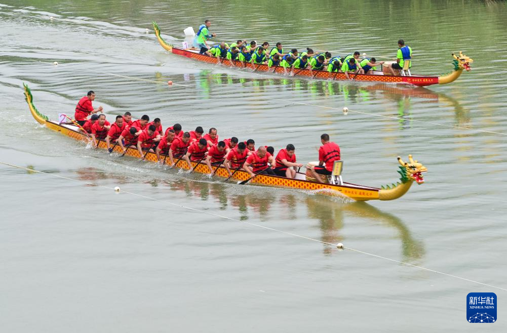 5月29日,在酉阳县龙潭镇,龙舟队在水面角逐。