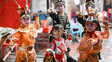 6月2日,小朋友在“何以永春”千年海丝非遗艺术展上了解闽南传统撵轿。