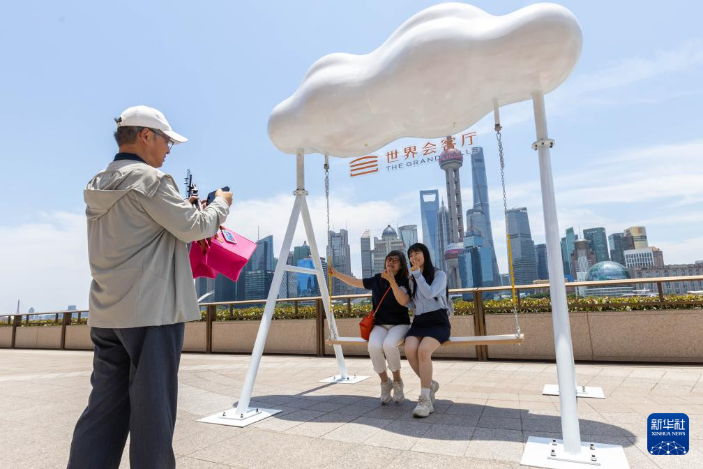 6月16日,市民在上海世界会客厅户外观景平台拍照留念。